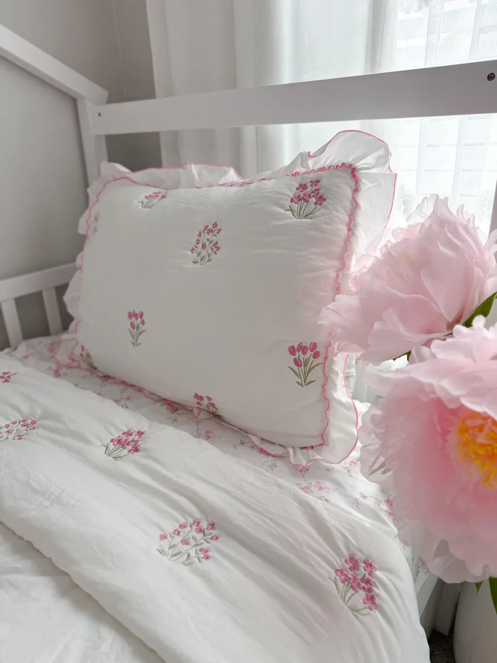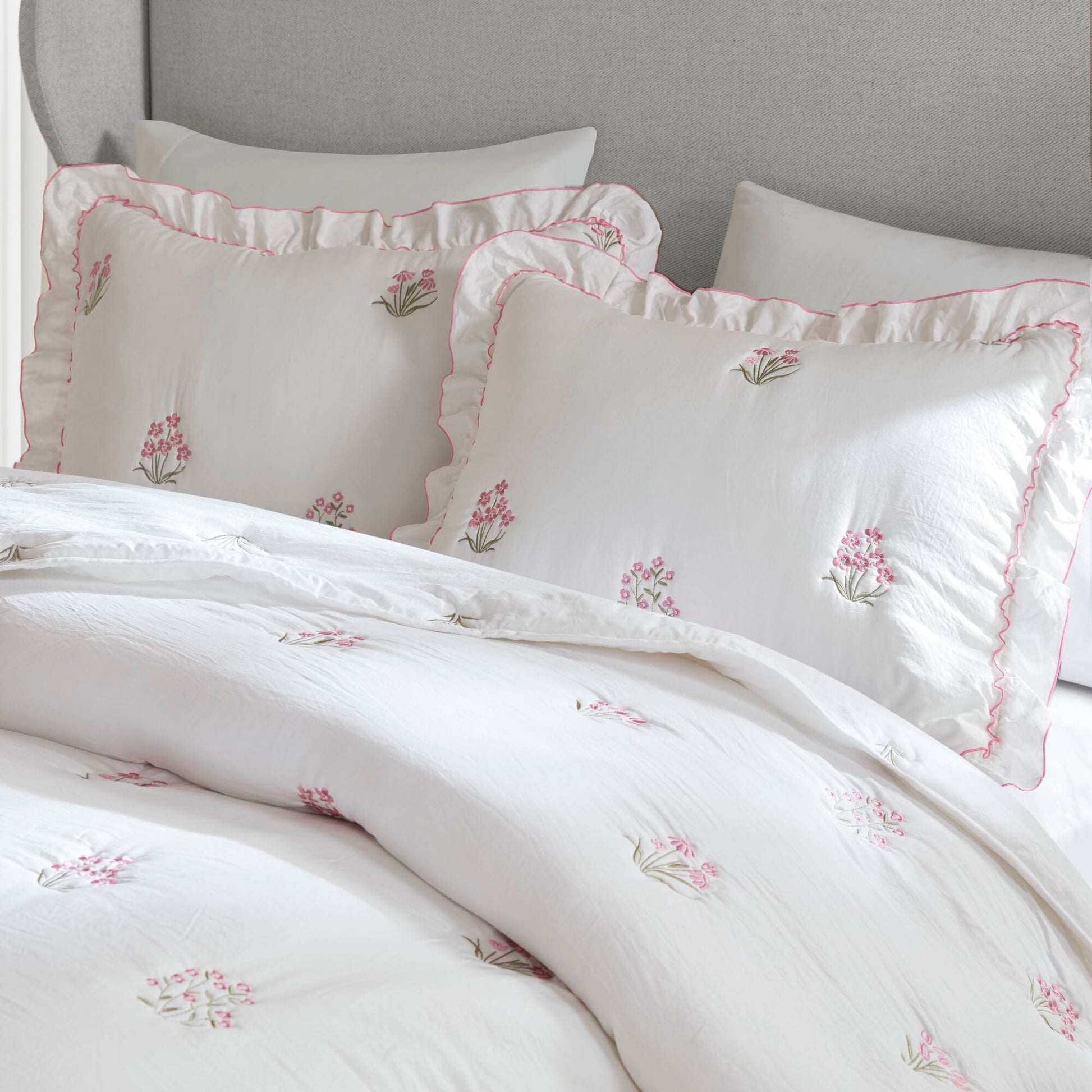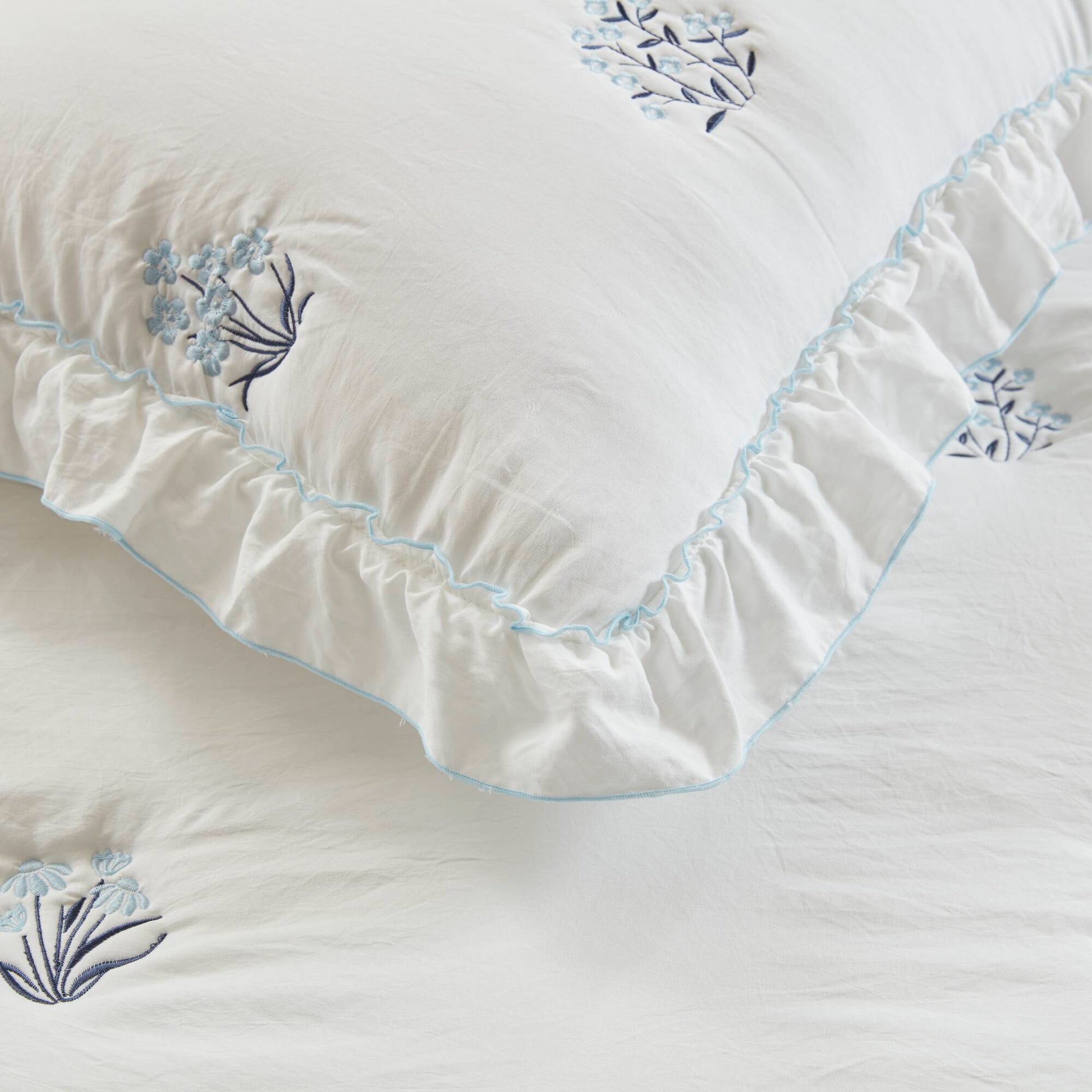 - Charming Ruffle Accent with Color Coordinated Overlock Stitching A graceful white ruffle decorated the quilt and shams, finished with color-coordinated overlock stitching that echoes the embroidery hue. This sweet layered detail feels both delicate and refined.