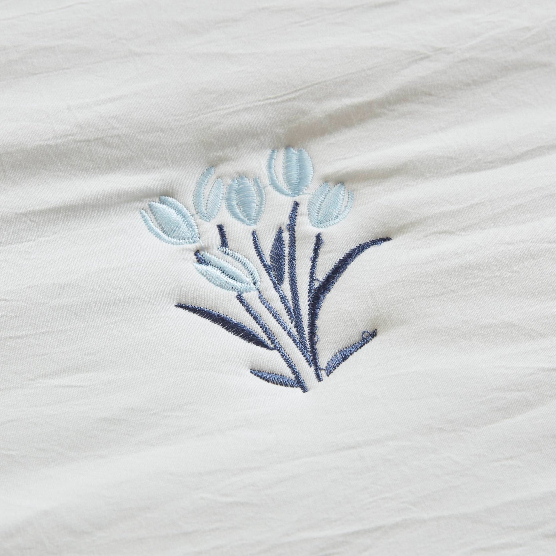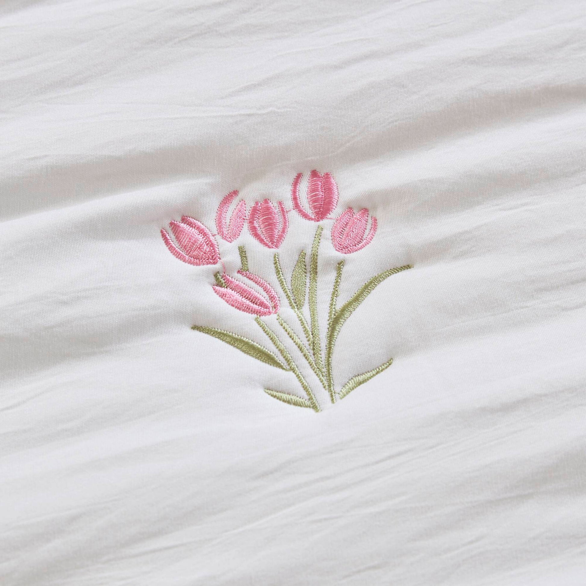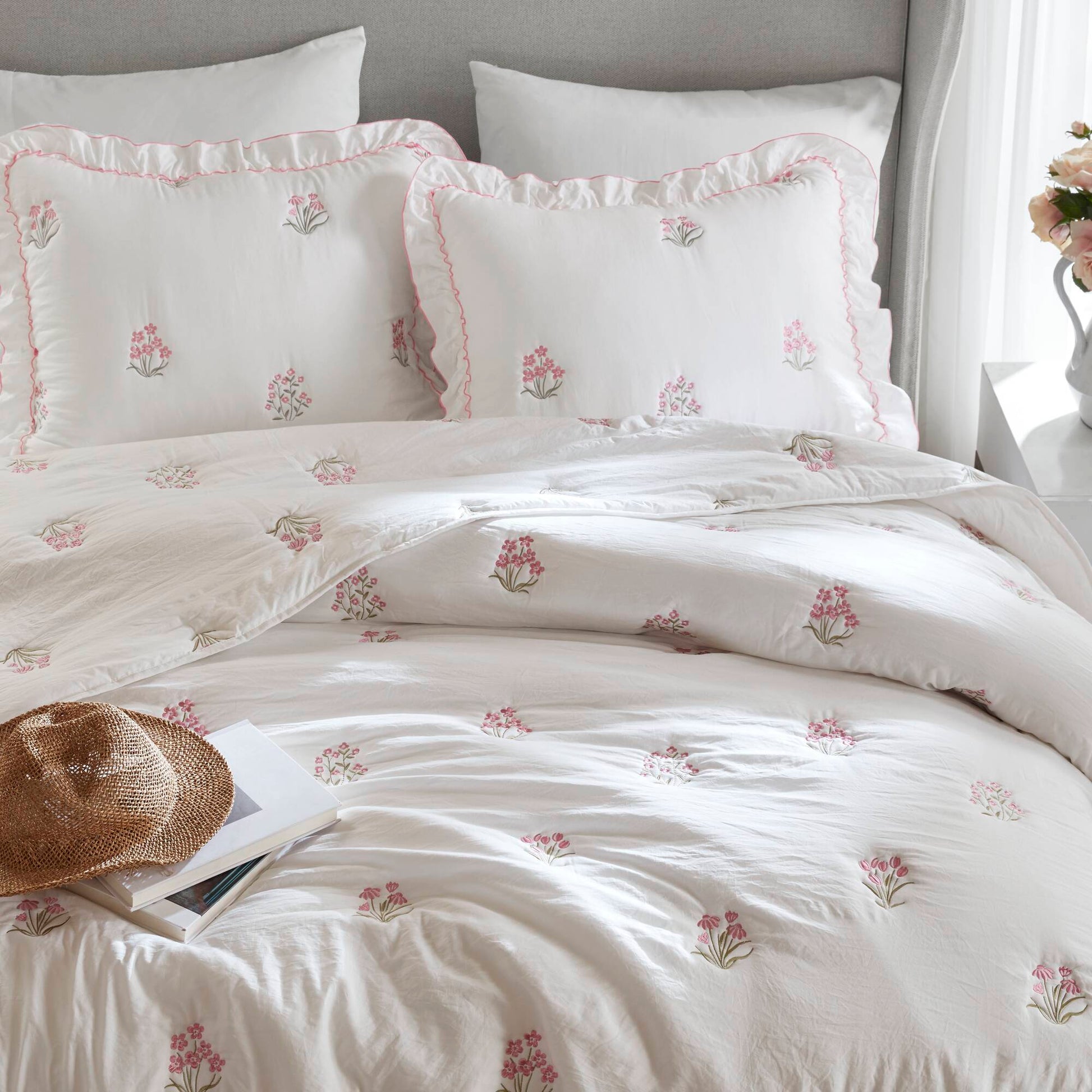 - Floral Embroidered Blossoms Design Delicately stitched with floral embroidered blossoms on a crisp white microfiber base, this quilt set brings an elegant yet youthful charm that is perfect for creating a romantic and airy bedroom look.