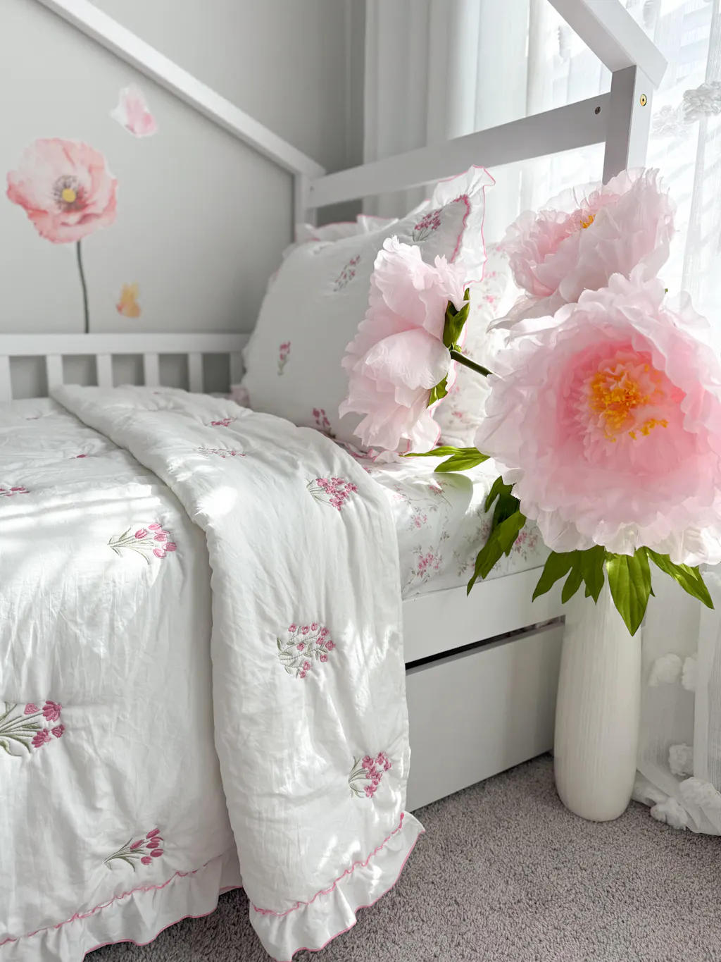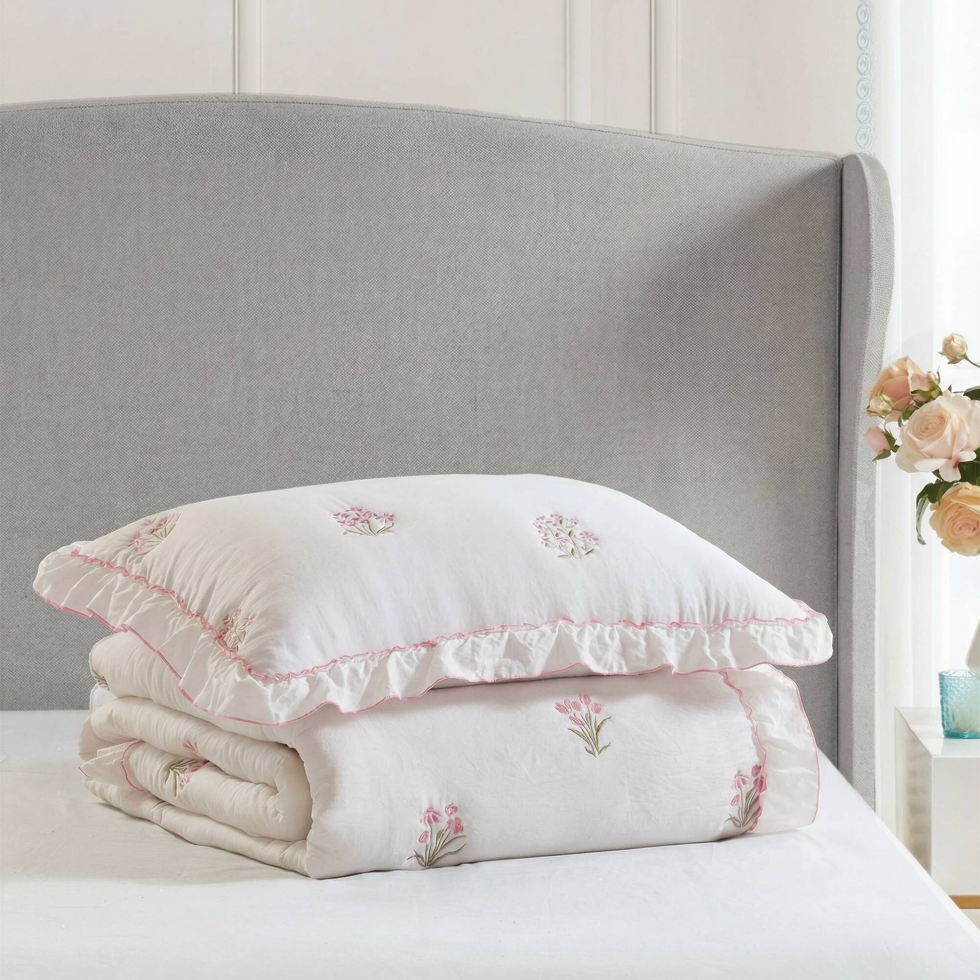 - Designed for a Romantic Youth Lifestyle With its soft color palette, floral embroidery, and ruffled edge, this quilt embodies a romantic sweet aesthetic that suits youth and young adults who want comfort with a feminine and dreamy touch.