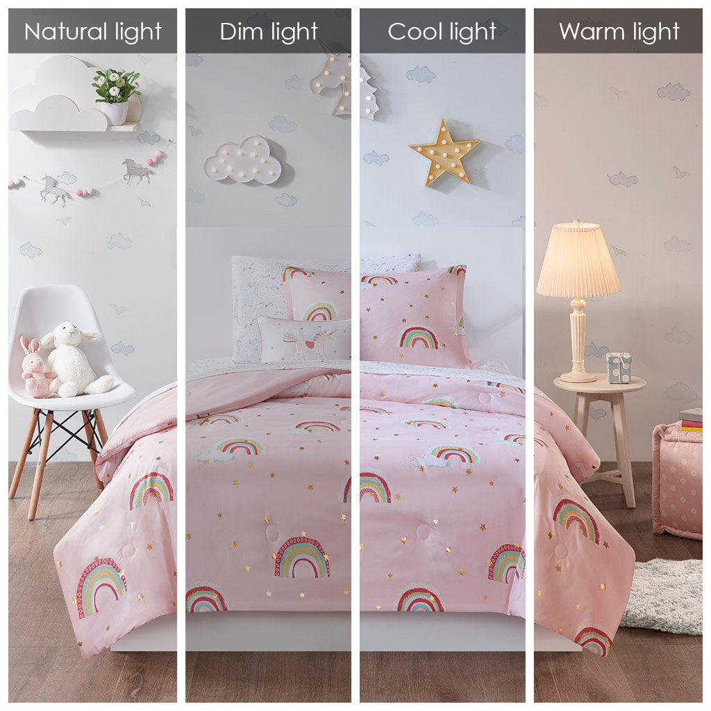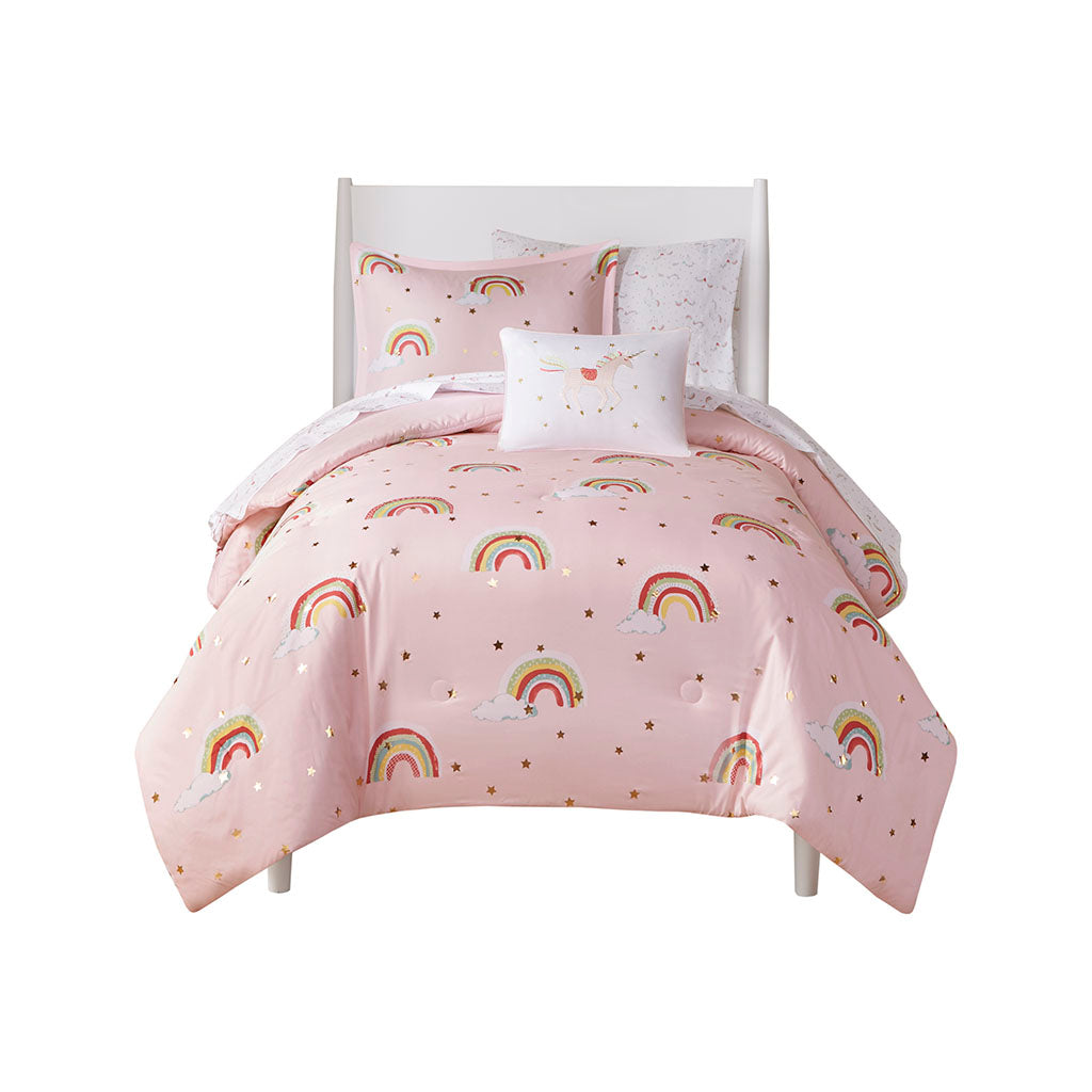 The Mi Zone Kids Alicia comforter features an adorable rainbow and gold metallic star print for a cute and playful look. The set includes a complete sheet set with a fun unicorn print coordinates beautifully with the comforter set.