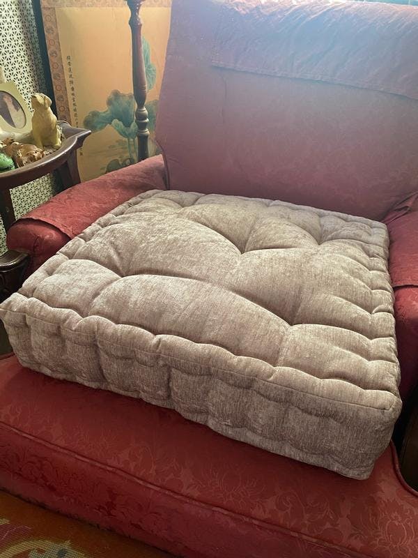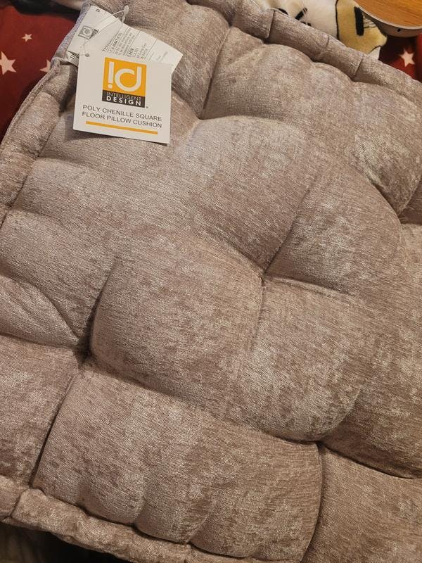 Soft and comfortable Poly Chenille Square Floor Pillow Cushion. This cushion is perfect for meditating on or if needed a cop a squat like the old days. Mine is a soft gray color and luster from fabric nature. It has a tufted detailing with a scalloped edge design. It can easily be spot cleaned with a mild detergent. It's 100% polyester filling and chenille covered. It's also OEKO-TEX certified which means chemical free. 20in. W X 20in. L X 5in. H