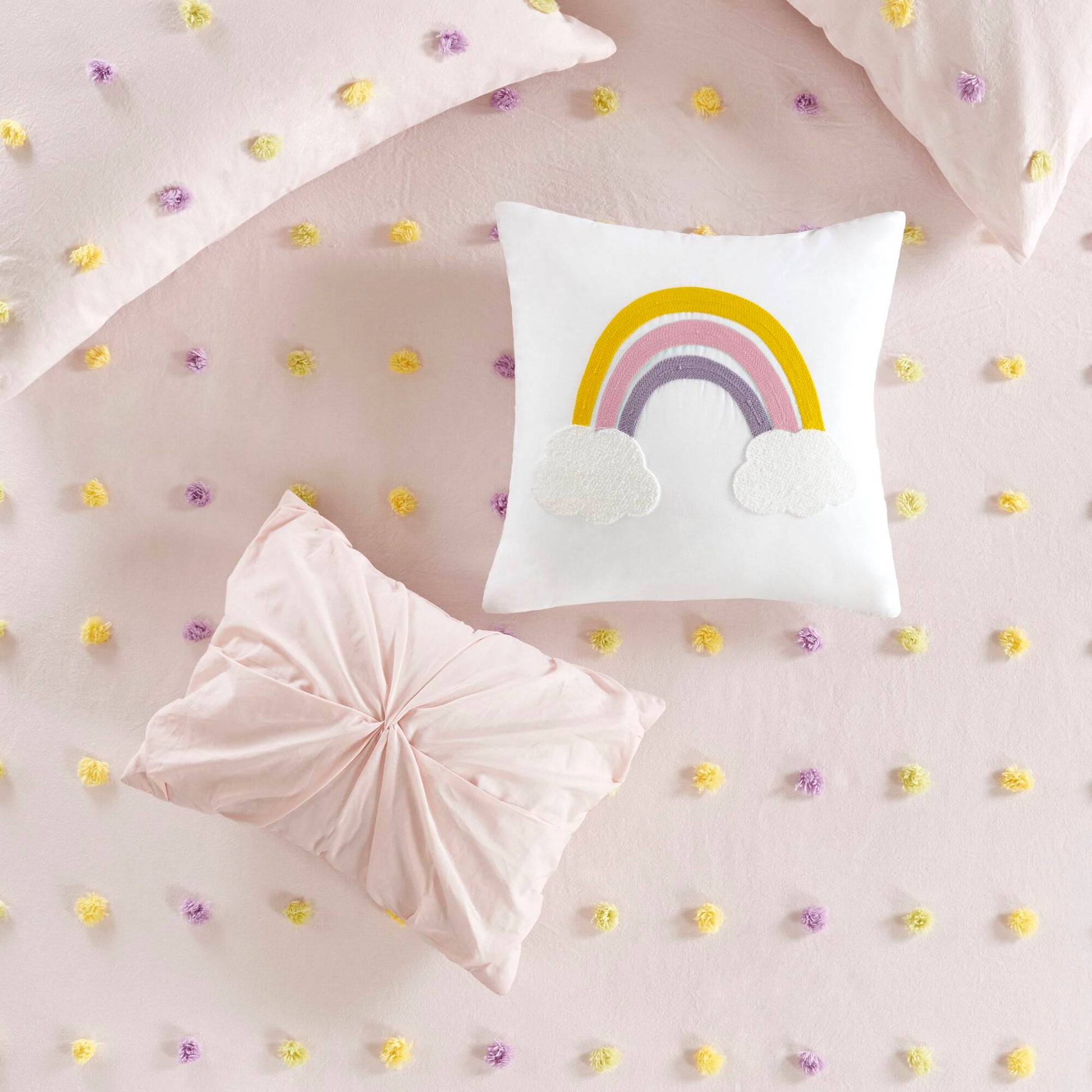 Decorative pillow in 16x16 features embroidered rainbow and cloud to match the clip cots on the comforter