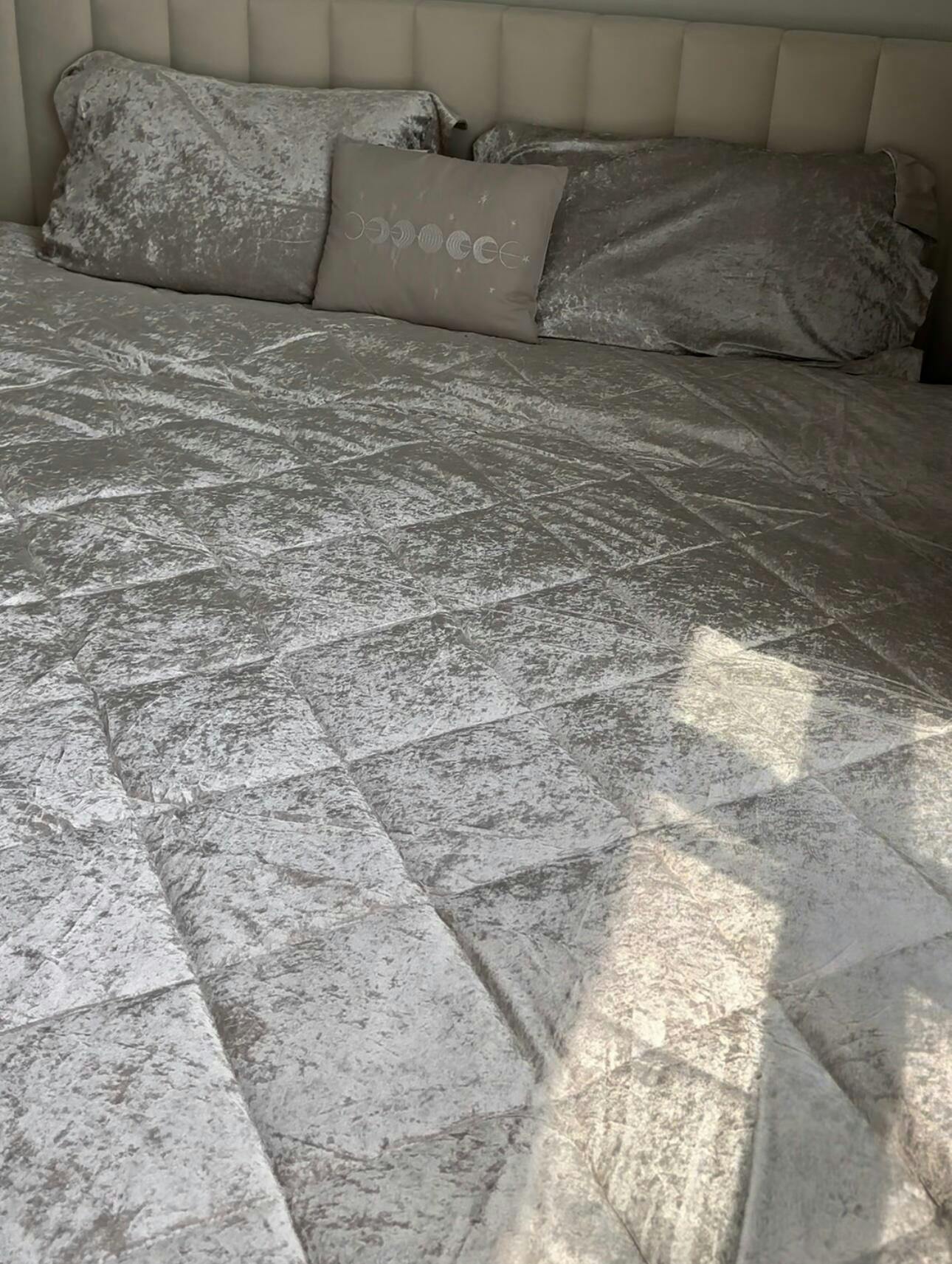 Luxurious crushed velvet comforter set features diamond quilting on top of the bed