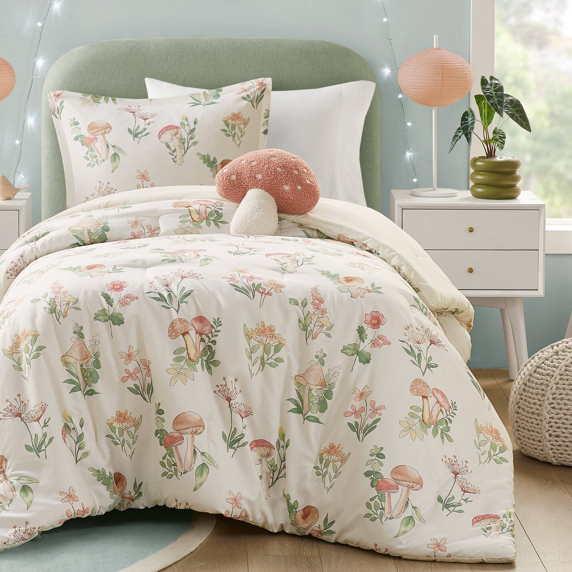Add an enchanting update to your bedroom with this mushroom and floral comforter set. Matching shams (1 in Twin/Twin XL) coordinate with the whimsical comforter, while a cute mushroom shaped pillow provides a fun and playful detail.