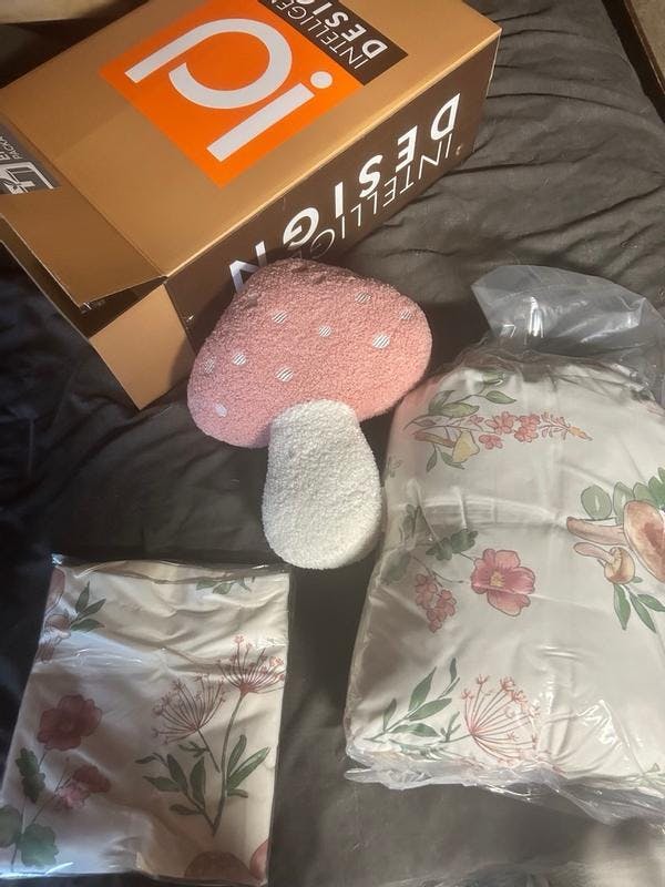This is the first time I saw a comforter set that has a fluffy mushroom. It is so cute! It is a cozy and soft all-season comforter. I love how big it is. It says twin/ twin XL but it has a very big cover for a queen size bed or mattress. The color is beautiful and comfortable looking. Love it!