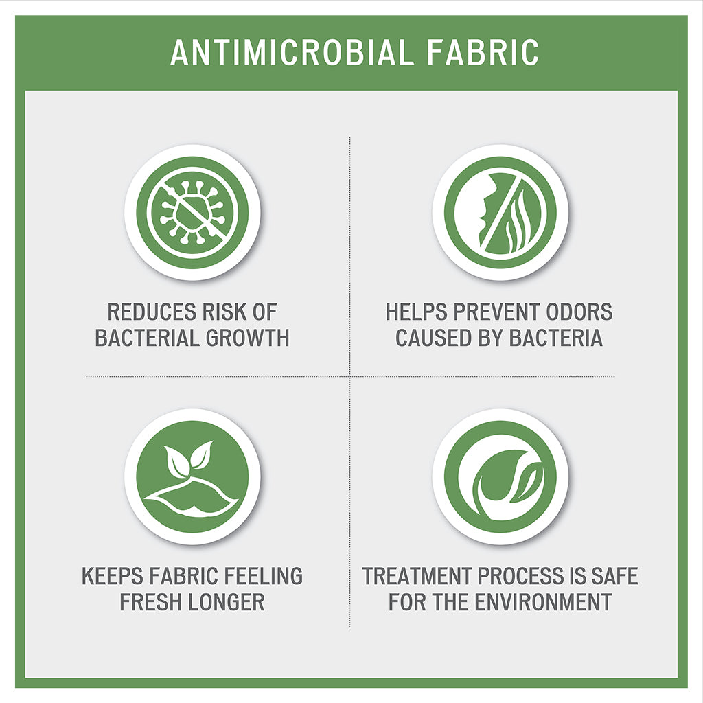 Antimicrobial treatment helps reduce the growth of odor causing bacteria and keeps fabric lasting longer