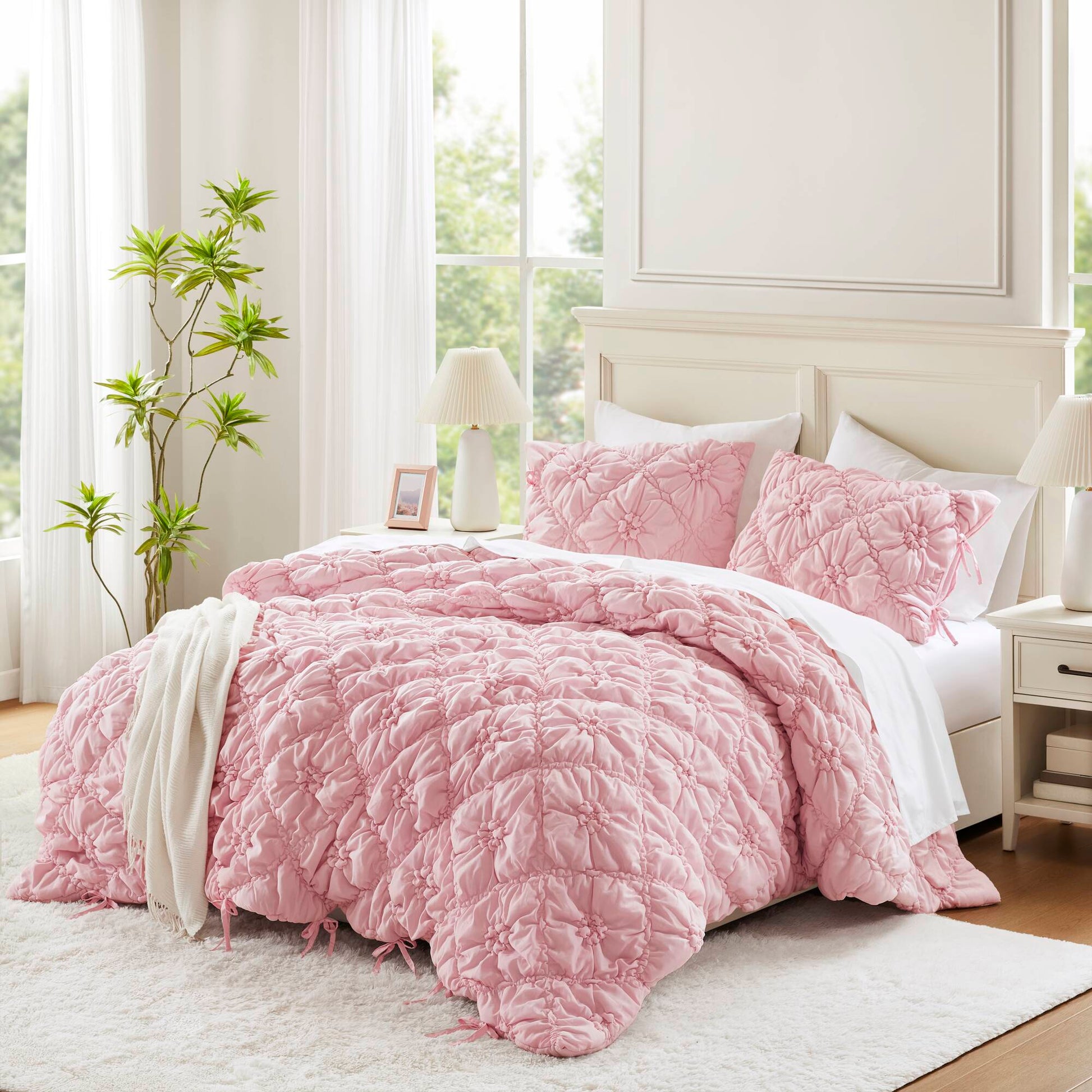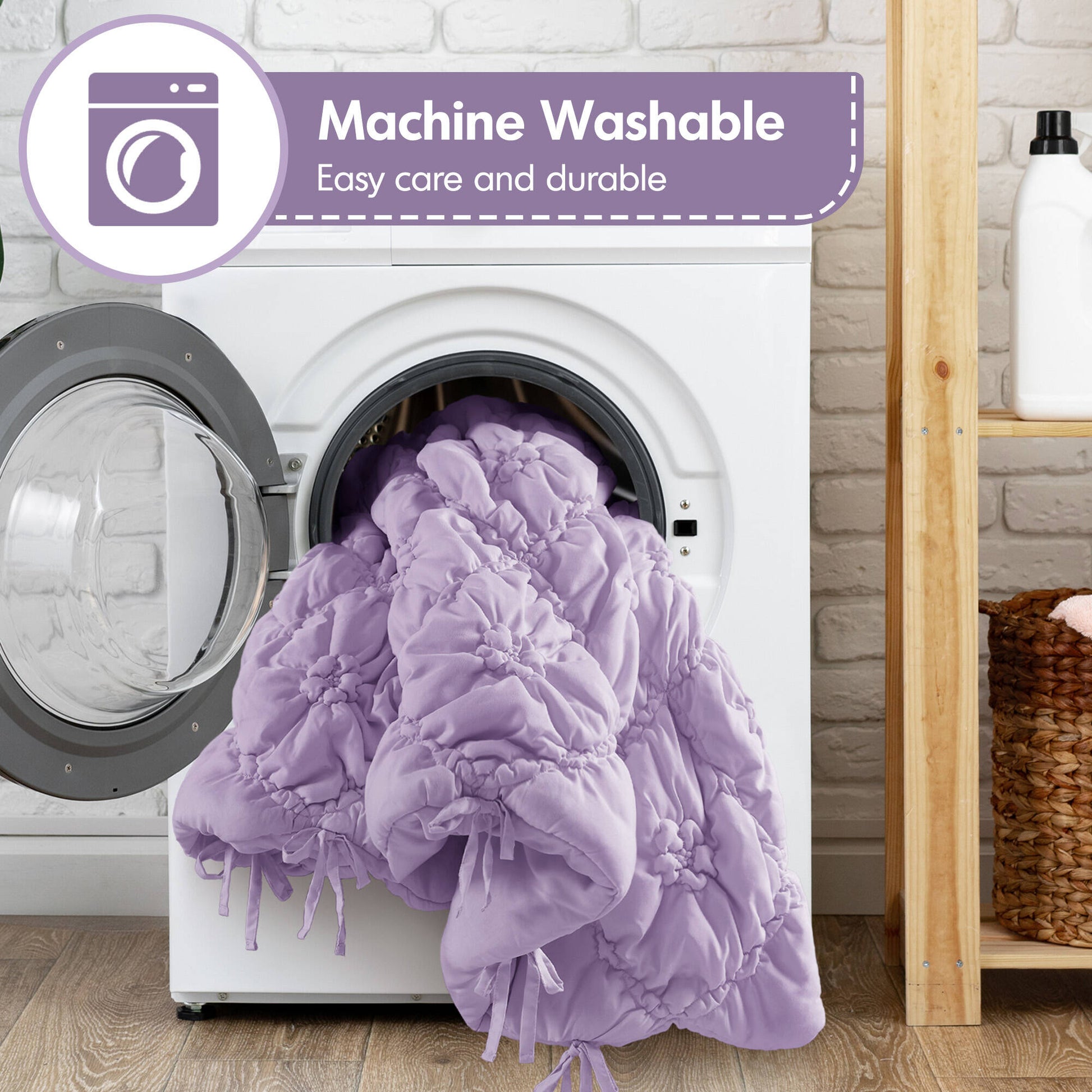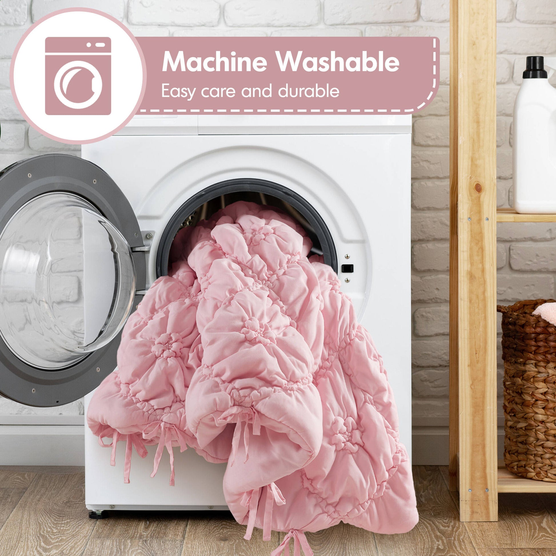 This puffy comforter set features cottage-inspired floral quilting and bow tie accents, crafted from soft brushed microfiber with relaxed embroidery and elastic ruching. Its puffy design provides cloud-like softness and warmth, ensuring cozy comfort year-round.