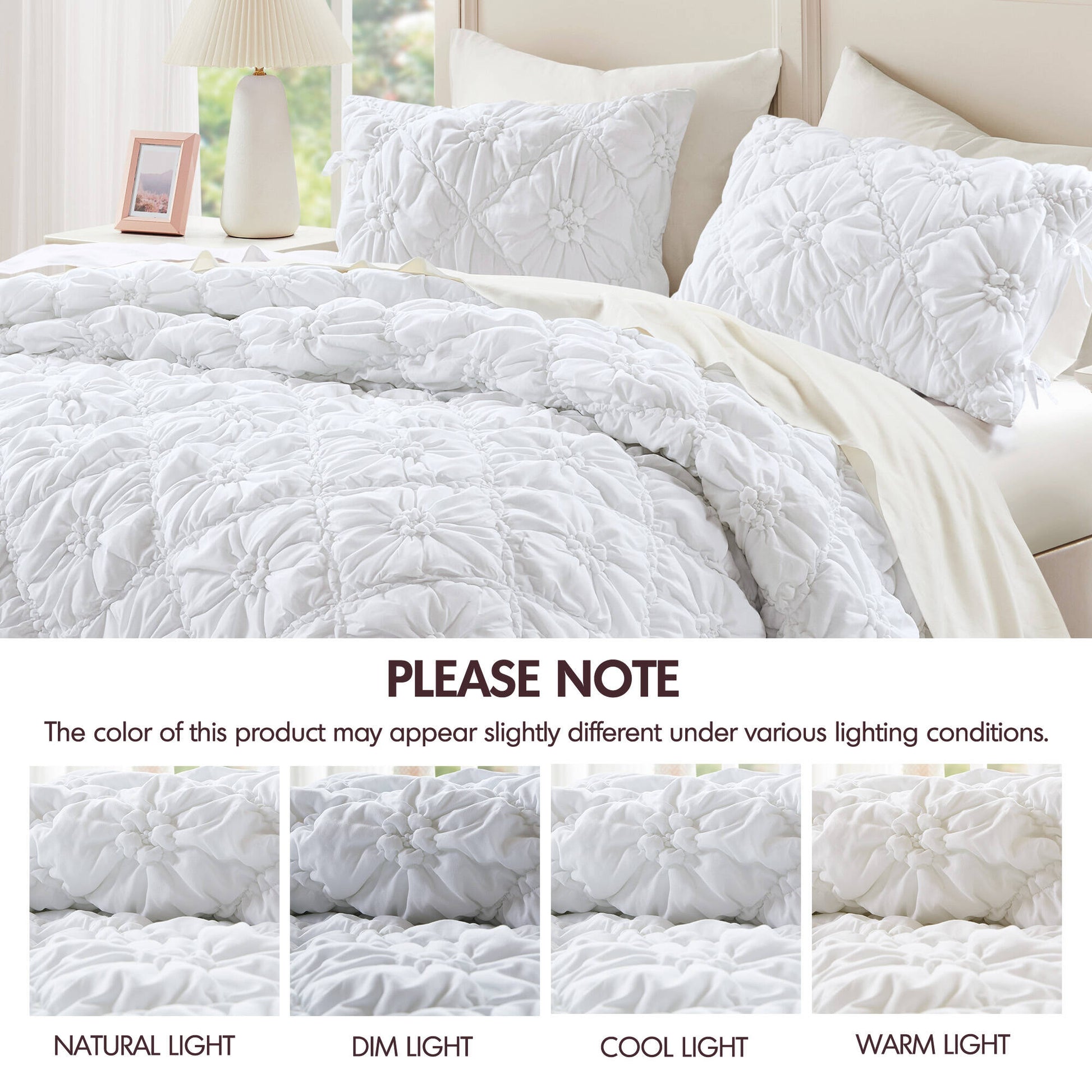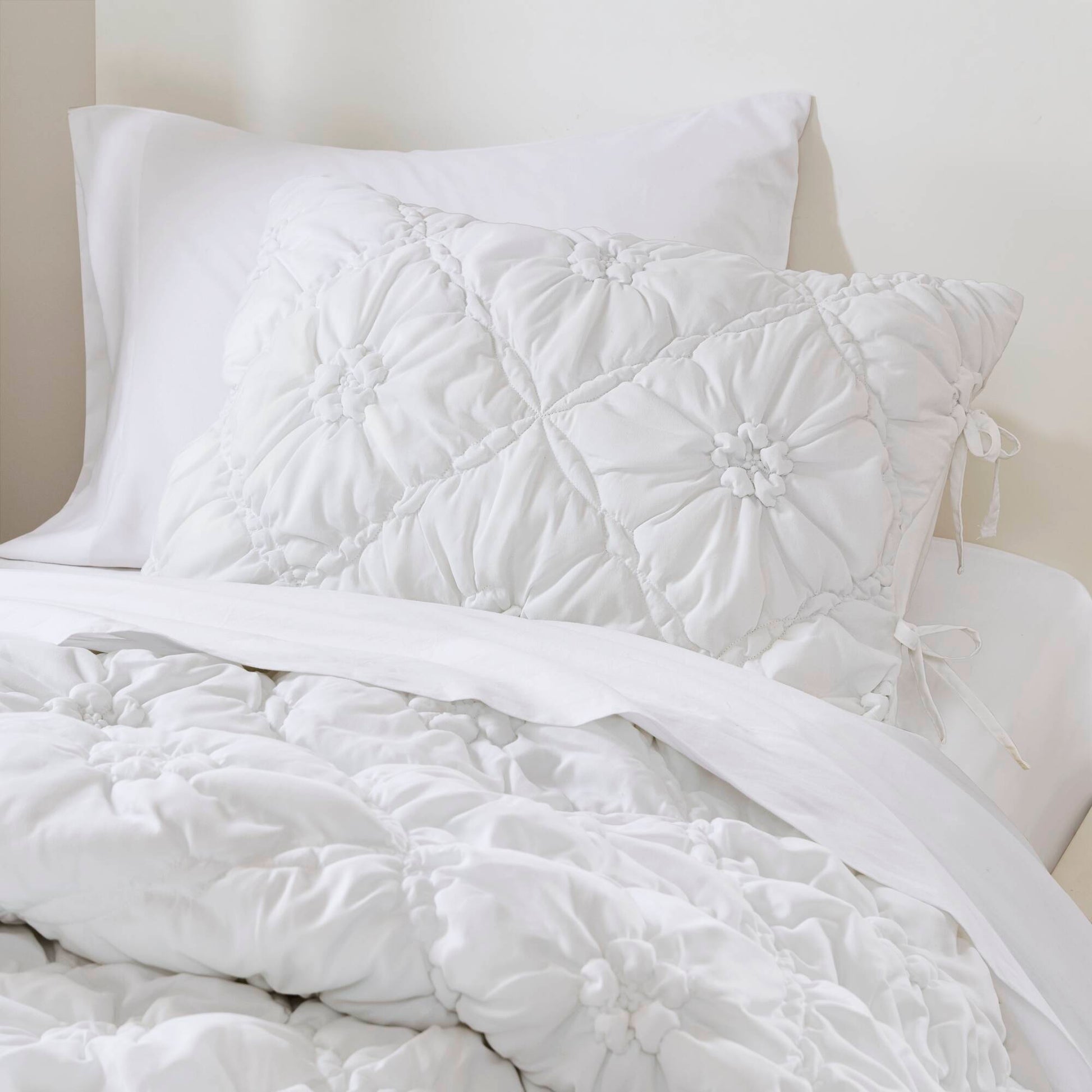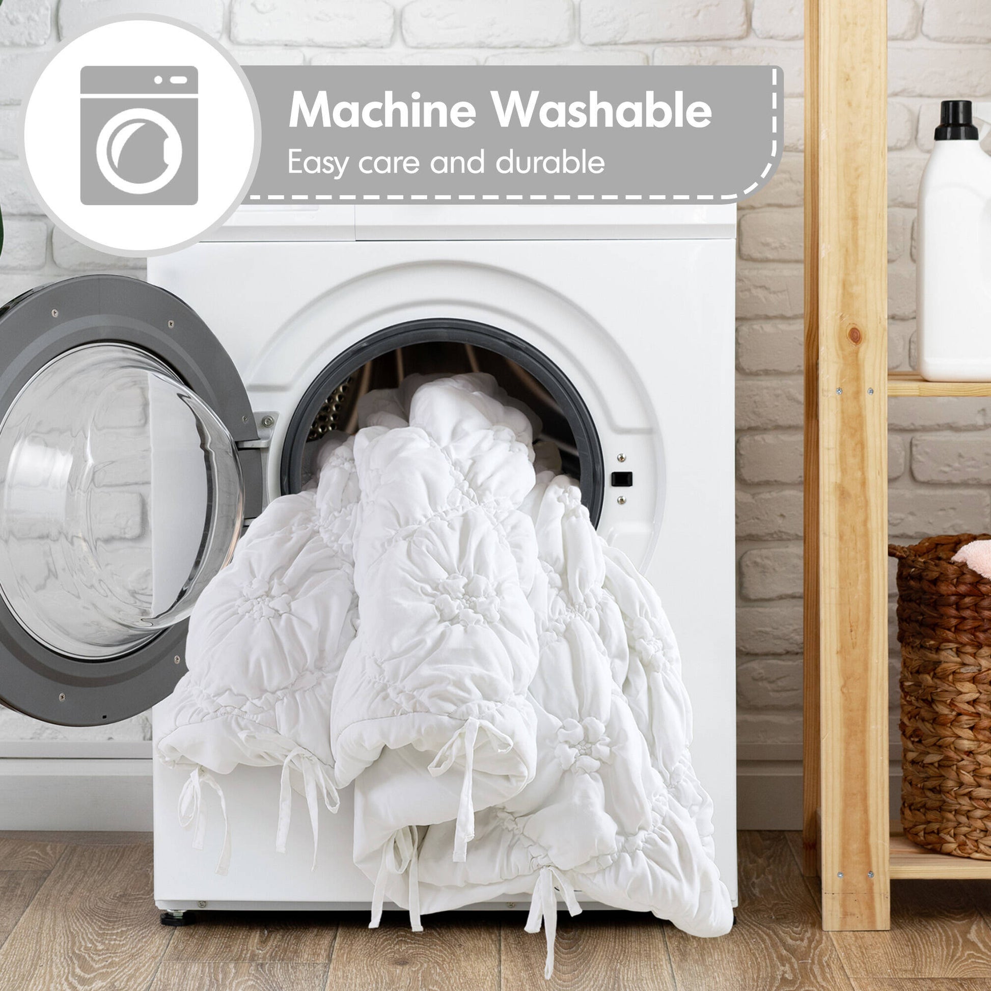 This puffy comforter set features cottage-inspired floral quilting and bow tie accents, crafted from soft brushed microfiber with relaxed embroidery and elastic ruching. Its puffy design provides cloud-like softness and warmth, ensuring cozy comfort year-round.