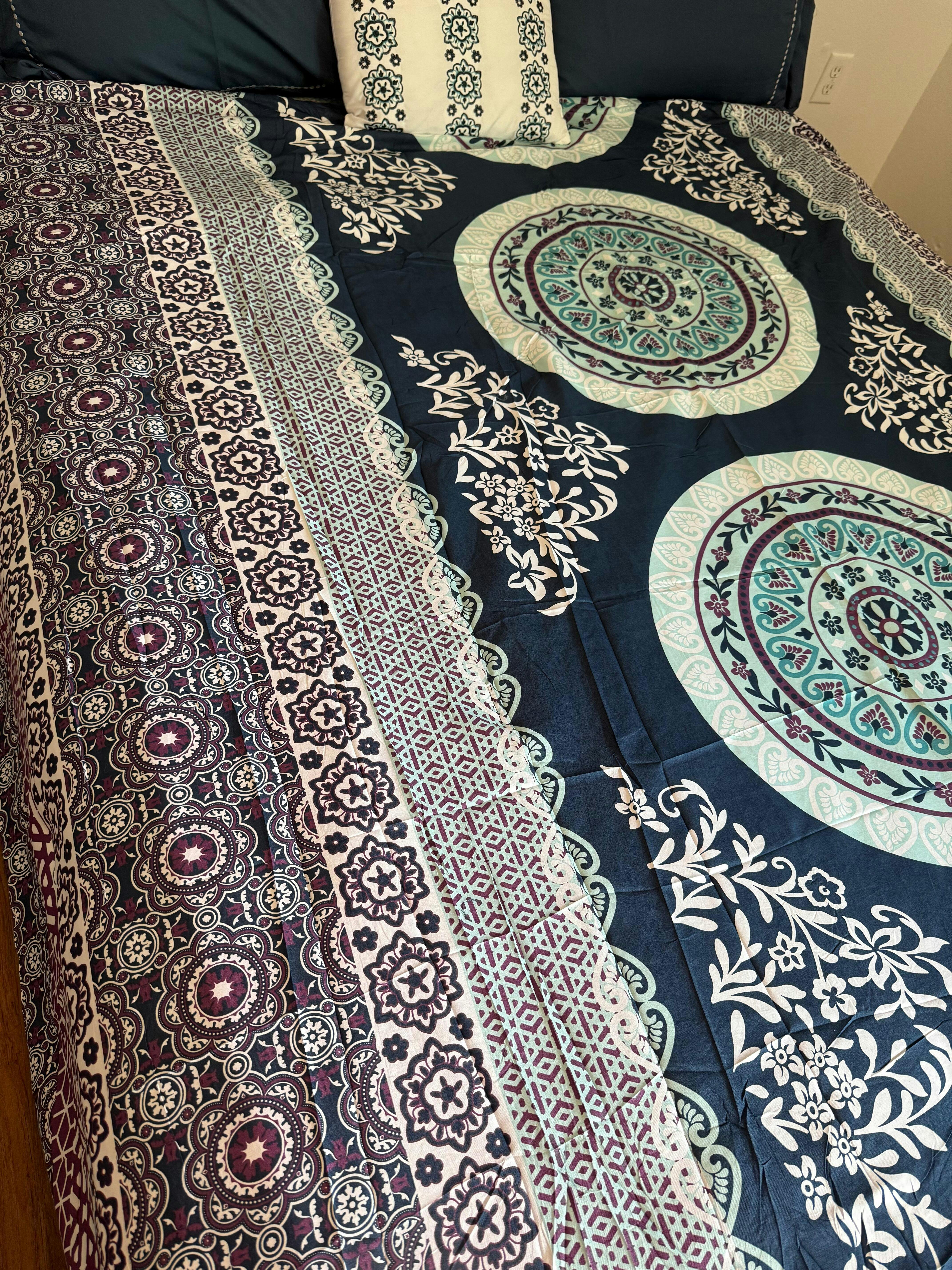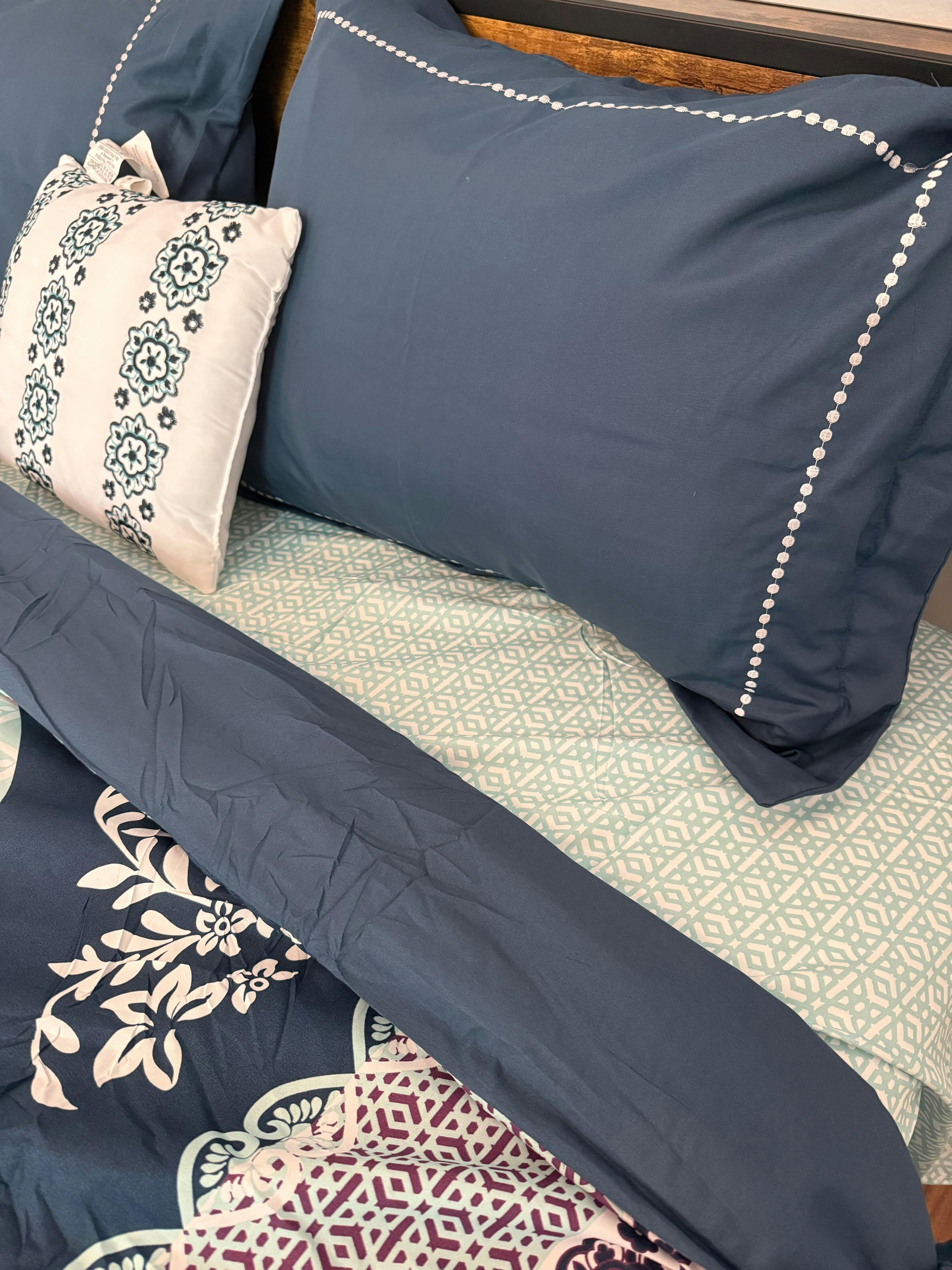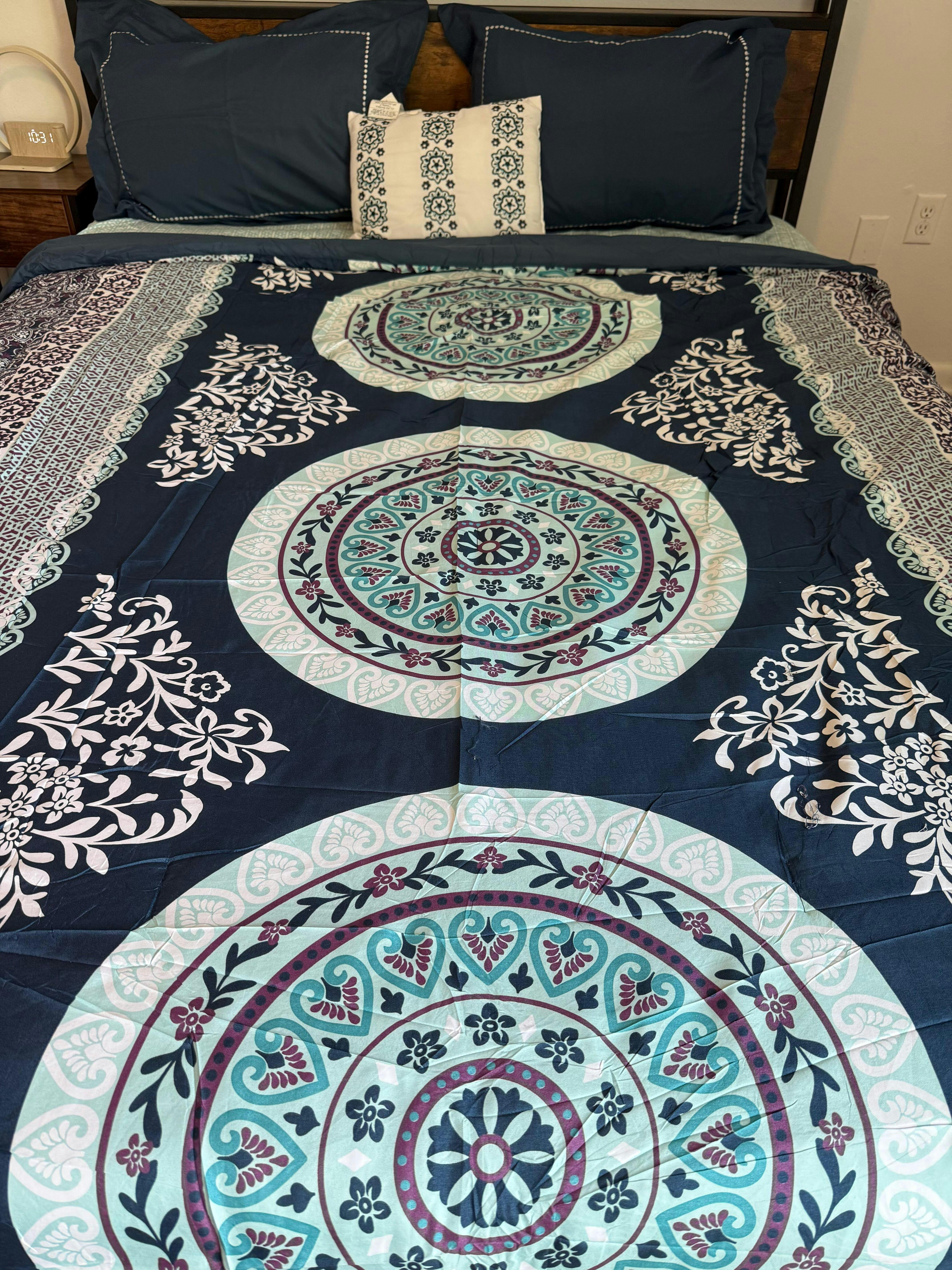 This Loretta brand comforter set is pretty beautiful. Boho style is very impressive and colorful. The pattern is very well designed with nice color combinations. This is twin size comforter set which came with sheet set. This set completes the full bed setting and brings boho vibes to bedroom. Breathable material and did not fade away color or shrink after coming out of washing. Machine wash is easy is maintenance. Fitted sheet sits well on mattress. I became a fan for this brand and would like to shop for different styles.