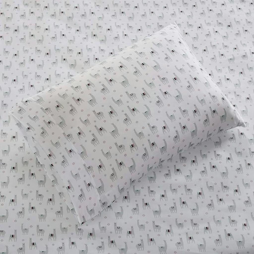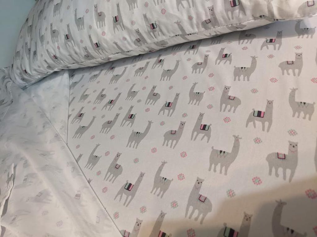 Who doesn’t love llamas! Both my kids, girl-7 and boy-3 do. I picked these sheets knowing either kid would use them. The set comes with a fitted sheet, top/flat sheet and standard pillow case. All 3 pieces are made from 100% polyester. They wash up nicely, no shrinkage. The fitted sheet has good elastic sewn all the way around, not just the corners. Being polyester makes the sheets slick to the touch but they barely wrinkle. (I left them in the dryer overnight once with no issues.)